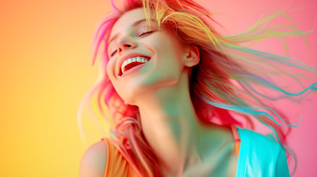 A joyful woman with colorful hair on a vibrant pink and orange background, creativity concept. Generative AI