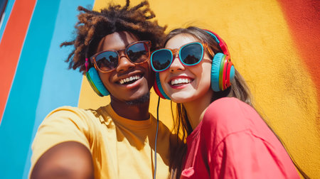 Colorful, vibrant photo of two teenagers with big headphones, wearing colorful and sunglasses, smile, look at the camera, taking selfie, standing against a bright wall.