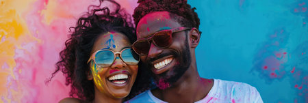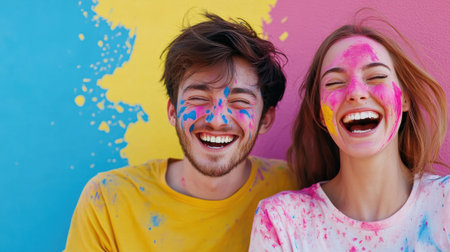 Joyful Couple Covered in Vibrant Paint Laughs Together, Celebrating Creativity and Fun