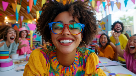 Enthusiastic woman celebrating with colorful decorations and afro hairstyle at a joyful party scene