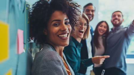 A group of diverse professionals smiling and collaborating in a modern office, surrounded by colorful sticky notes. This image captures the essence of teamwork and creativity.