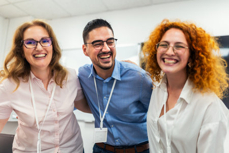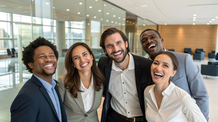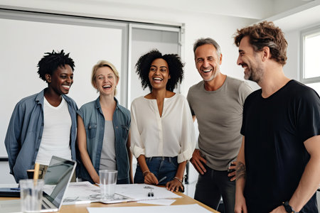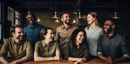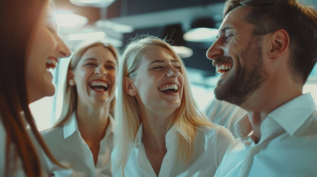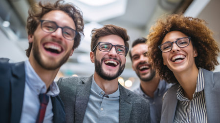 Group of cheerful professionals laughing together in modern office setting, showcasing camaraderie and teamwork. Their joyful expressions reflect positive work environment
