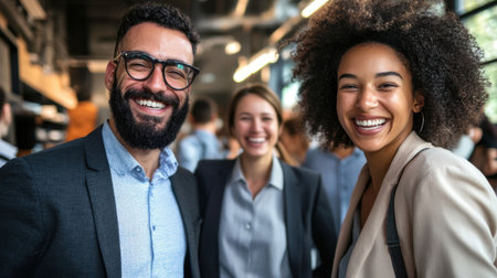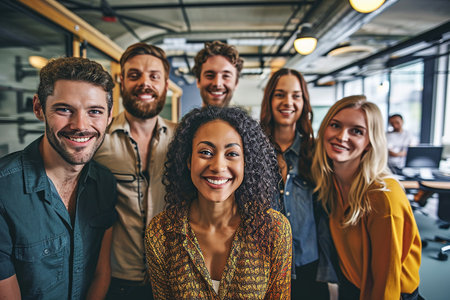 Proud and united, the members of a successful business team smile brightly in the office, conveying confidence as they face the camera.