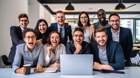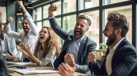 A diverse team of business professionals ecstatically celebrating their success in a modern office, expressing triumph and unity after achieving their goals