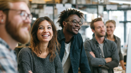 Group of diverse professionals share smiles and ideas in a vibrant office setting during a meeting.