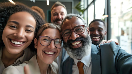 A group of five young professionals gathered around a desk taking a cheerful selfie. The background shows an open office space with modern lighting.