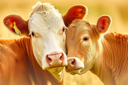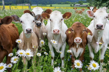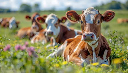 Experience the charm of countryside life with adorable cows amidst vibrant seasonal flowers This fresh take on rural scenes showcases nature's beauty, blending animals and flora harmoniously Discover this picturesque setting where cows and flowers unite in a stunning, idyllic display of rural life AI Generative