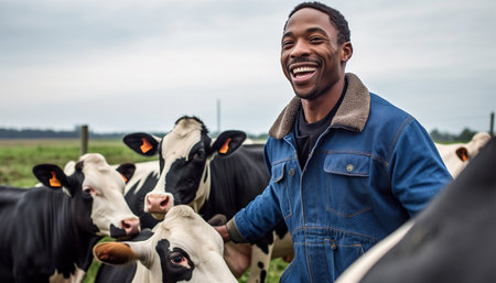 Portrait of positive African-American male worker in blue robe working on dairy farm with black and white cows. Happy black farmer Dutch cows and wearing blue overalls on fresh Agriculture field Modern farmer