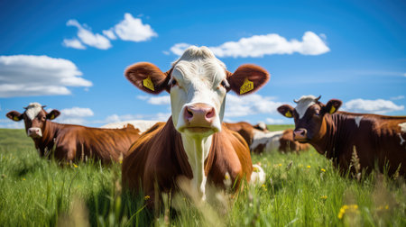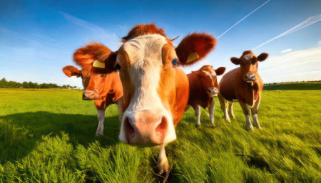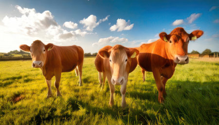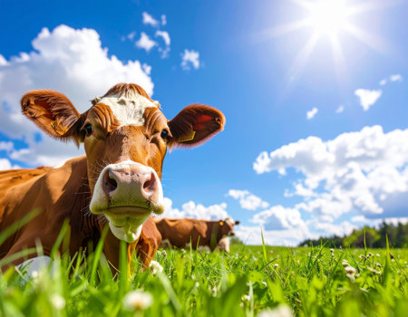 AI generated cheerful beef cattle peeking with friendly smile from side view in sunlit green meadow under vibrant blue sky with fluffy white clouds perfect for farming and agriculture themes