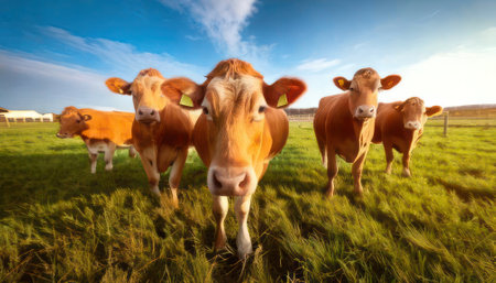 A group of curious cows looks directly at the camera from a low angle, set against a striking blue sky and fluffy white clouds, capturing a delightful farm moment.