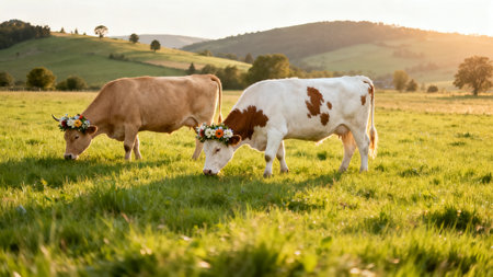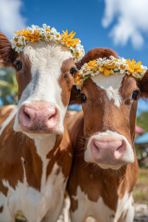 Two cows adorned with flower crowns stand together in a sunny pasture. Lush greenery surrounds them as they peacefully graze, creating a cheerful scene in the countryside.