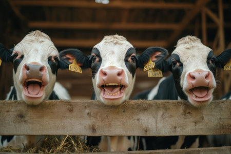 Three cows in a barn appear to be laughing, showing teeth. Light-hearted animal humor and rural charm.