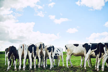 Home on the range. Rearview shot of a herd of cattle grazing on a dairy farm.