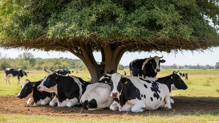 Group of black and white cows resting under a tree in pasture