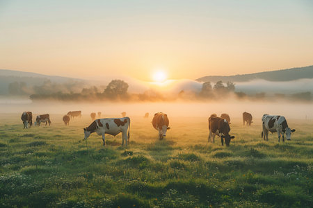 Cows grazing in a meadow at sunrise in the countryside.
