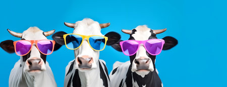 Creative animal concept. Group of cow friends in sunglass shade glasses isolated on solid background, commercial, editorial advertisement, copy text space
