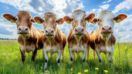 A charming display of five playful calves posing under a clear blue sky with fluffy clouds, symbolizing the beauty of farm life and showcasing the innocence of young animals.