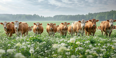 Curious Cattle Group Grazing Peacefully in a Beautiful Rural Landscape Field during Summer Days