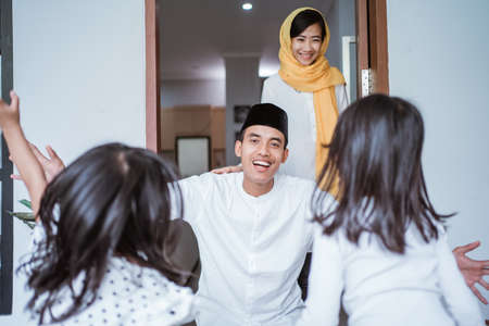 asian muslim aged couple meeting kids and grand children at doorstep during eid mubarak