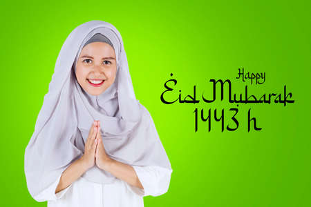 Young Muslim woman s showing congratulate hands gesture while standing with Happy Eid Mubarak text in the studio with green screen background