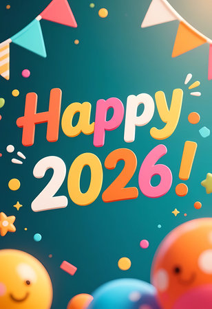 Colorful decorations surround the text wishing a happy 2026. Bright balloons and playful shapes fill the space, creating a festive atmosphere for greeting the new year.