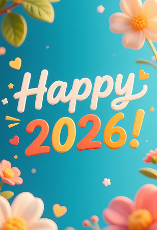 Colorful decorations surround a cheerful greeting for the year 2026, featuring flowers and hearts, creating a joyful atmosphere for celebration.