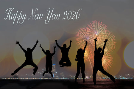Silhouette happy teamwork jumping and cheering crowd fireworks congratulation graduation in Happy New year 2026. Freedom lifestyle group people jump as part of Number 2026