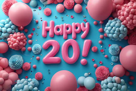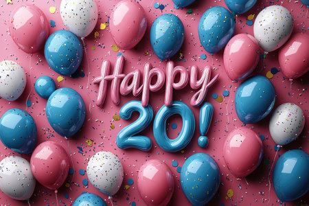Greeting card for 20 years. Festive scene with pink party hat, candy hearts, and confetti celebrating a 20th birthday.