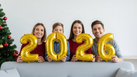 A smiling family of four sits on a sofa holding golden foil balloons spelling out 2026. A Christmas tree is visible, indicating a festive holiday celebration.
