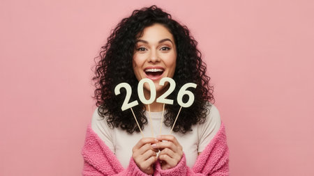 Portrait of a happy young woman with curly hair and a wide smile holding a 2026 sign. She is celebrating the future and new beginnings against a pink backdrop.