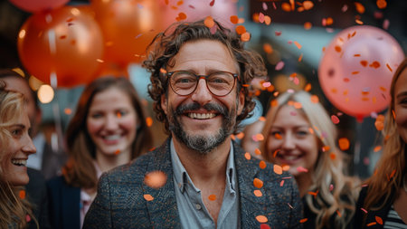A man laughing stands joyously as colorful confetti cascades around him, creating a festive atmosphere. His expression exudes happiness and celebration in this lively moment.