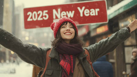 Excited woman with arms raised, celebrating the arrival of the New Year 2025 in a snowy city. Ideal for New Year promotions and festive greetings.