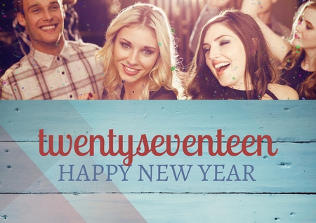 2017 happy new year wishes on wooden panel against people enjoying in club