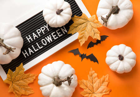 Happy Hallooween backgroung. Flat lay composition on orange paper. White pumpkins and bats.