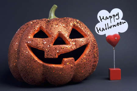 Happy Halloween orange color fun pumpkin with scary face and red heart sign and message on black background