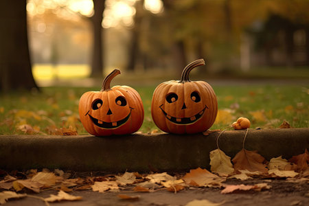 Two cute halloween pumpkins in autumn park background. Generative by AI.