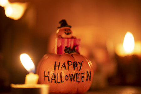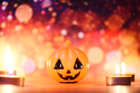 Halloween background candlelight orange decorated holidays festive concept / funny faces jack o lantern pumpkin halloween decorations for party accessories object with candle light bokeh