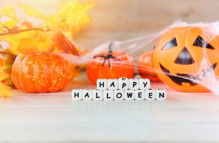 Halloween background orange with word blocks happy halloween decorations and pumpkin jack o lantern funny spooky spider web and black spider on white wooden table happy holiday concept