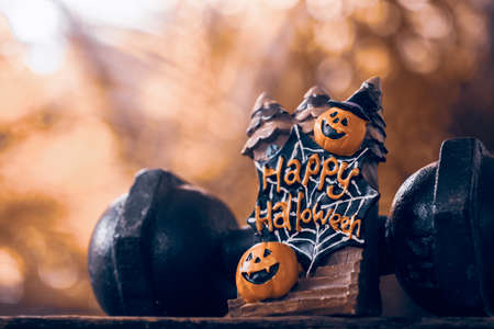 Halloween festival Close up of Halloween head Pumpkins doll and the black iron dumbbell. Fitness, healthy active lifestyle on Halloweeen day concept.
