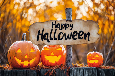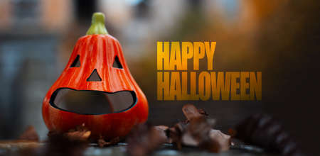 Close-up of Happy Halloween text and orange pumpkin, on blurred outdoors background.