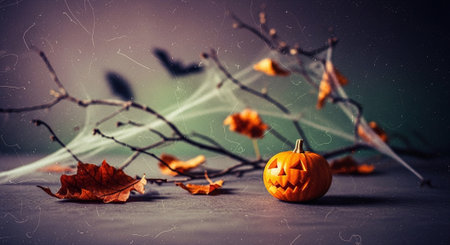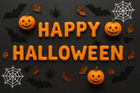 Pumpkin halloween greeting with jack-o-lanterns, spiders, and bats on a dark background. concept of halloween celebration, festive theme, seasonal decorations.