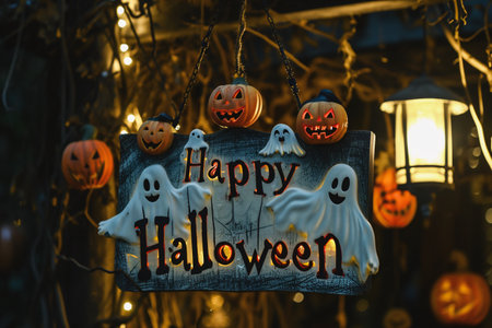 Halloween decoration with pumpkins, ghosts and lanterns at night