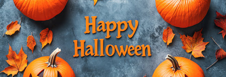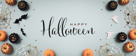 Halloween holiday background with party decorations from pumpkins, bats, ghosts, spider webs on blue top view. Greeting card with text inscription Happy Halloween in banner format.