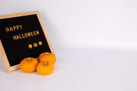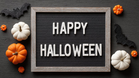 Black letter board with Happy Halloween message surrounded by mini pumpkins and bat cutouts