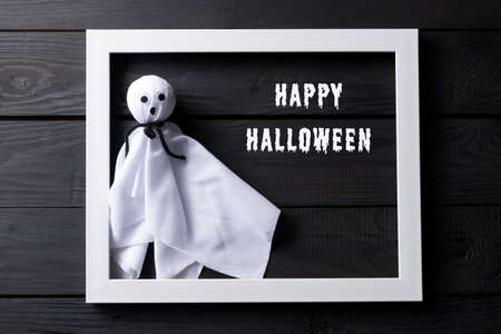 Top view of Halloween crafts, fabric ghost on black wooden background with text. Halloween concept.