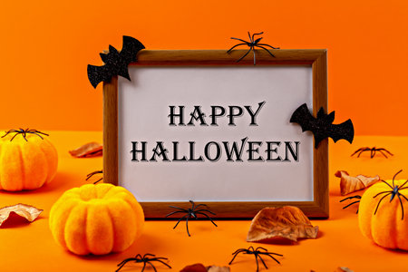 Halloween. Frame with inscription Happy Halloween surrounded by bright orange pumpkins and decorative spiders, creating festive atmosphere perfect for seasonal designs