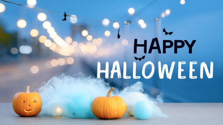 Halloween-themed display with carved pumpkins, decorative elements, and soft fog, illuminated by string lights, creating a festive and enchanting ambiance for the holiday