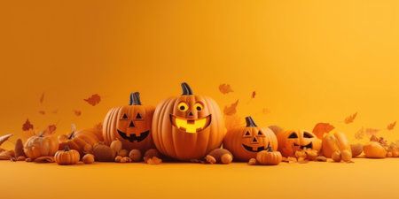 Happy Halloween. Pumpkins and autumn leaves on an orange background. Place for text, banner format