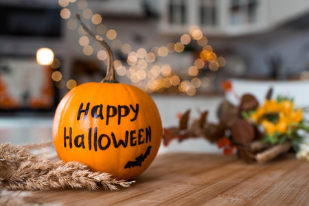 Autumn flowers, Jack's pumpkin and candles on a tray. In the background is the interior of a white Scandi-style kitchen. The concept of home and comfort. Autumn decor for Halloween