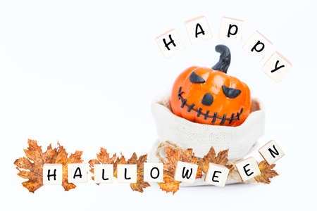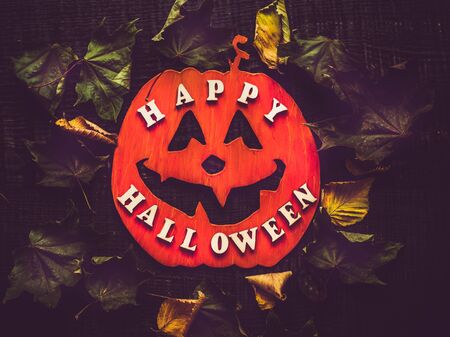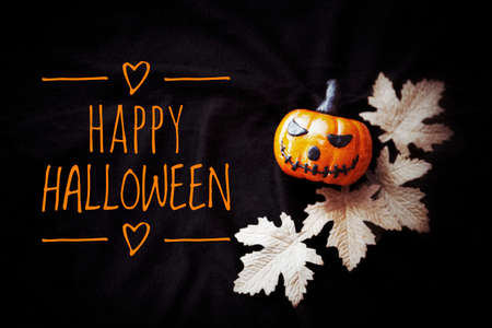 Happy Halloween sign with funny Halloween pumpkin with paper leaves on black fabric texture background, Halloween decoration item